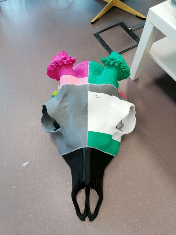 Wydruki były zrealizowane jako wydmuszki i wypełnione wewnątrz pianką poliuretanową oraz wzmocnione wewnętrznie konstrukcją z prętów gwintowanych. Następnie wszystkie elementy zostały ze sobą sklejone, zaszpachlowane i pomalowane.