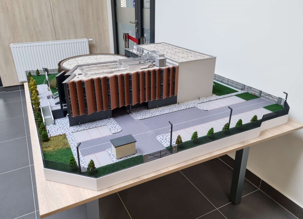Największym wyzwaniem w przypadku tej realizacji było dobranie odpowiedniej technologii do danego detalu makiety. Podstawa została wyfrezowana na obrabiarce CNC a następnie ręcznie „zasialiśmy” trawę, przykleiliśmy kamienie wokół budynku, pomalowaliśmy schody, umieściliśmy krzaczki, drzewa. Ogrodzenia, detale typu wentylacja, kamery, dzwonki, oświetlenie, ławki, kosze na śmieci itd. zostały wydrukowane w technologii Druku 3D. Detale elewacji, które imitowały oryginalne miedziane dekory, zostały wycięte laserem i zadrukowane w technologii UV. Natomiast ściany budynku częściowo zostały wycięte i grawerowane laserem. Elementy elewacji, które były gładkie zostały wyfrezowane – wylicza Mateusz Stefańczuk.